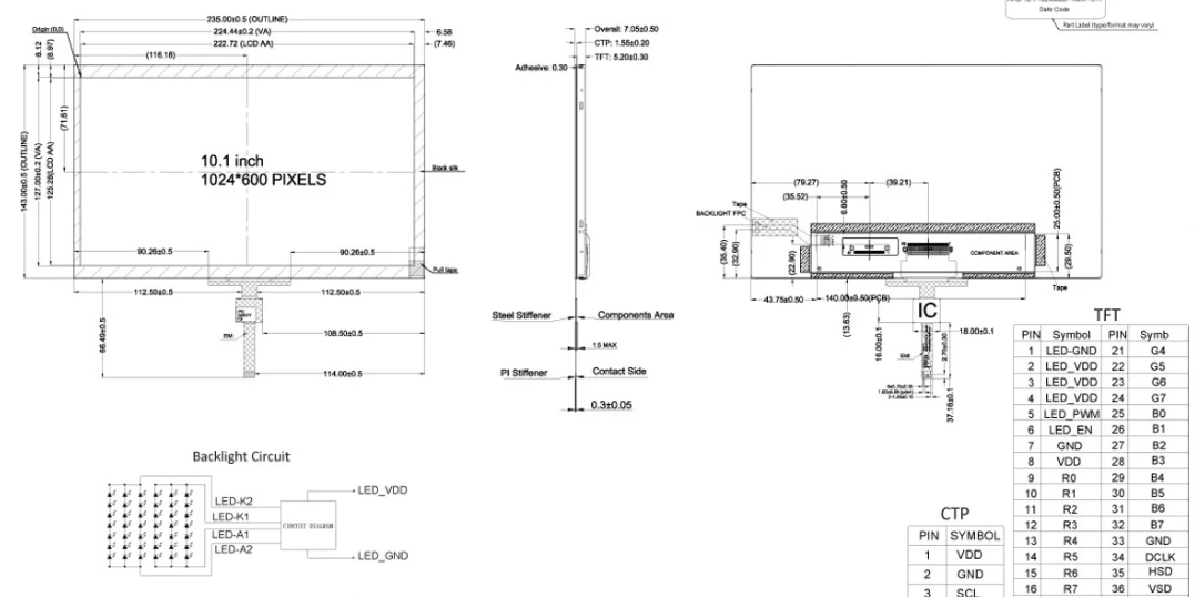 Jeho tenké rozměry pouze 235 mm × 143 mm × 7,05 mm jej předurčují pro kompaktní zařízení. 10,1palcový průmyslový modul dotykové obrazovky PCAP, napájený 3,3 V a pomocí 40kolíkového kabelu FFC (6kolíkový FFC pro CTP), pracuje při teplotách od -20 °C do 70 °C a má rozsah skladovacích teplot -30 °C až 80 °C, což zajišťuje spolehlivý provoz i v náročných prostředích.