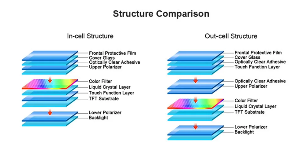 Technologie In-cell představuje strukturální revoluci v displejích, protože odstraňuje dvě vrstvy: spojovací vrstvu a dotykovou vrstvu. Díky těmto dvěma méně vrstvám jsou zřejmé dvě výhody: za prvé, struktura je mnohem tenčí, o 1-2 mm tenčí než tradiční struktury; za druhé, efekt zobrazení je lepší, protože ztráta optické propustnosti je menší kvůli sníženému počtu vrstev.